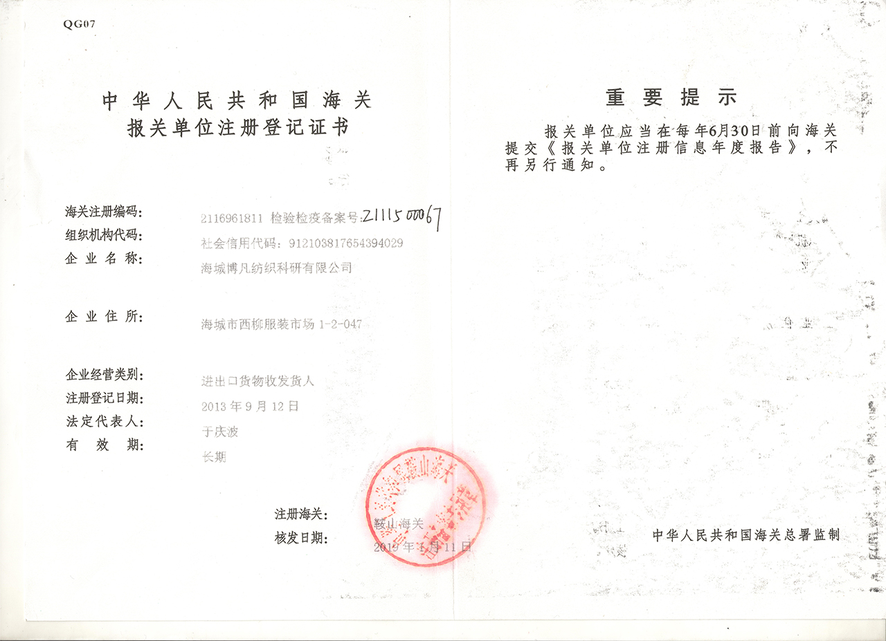 海城博凡紡織科研有限公司 開戶許可證